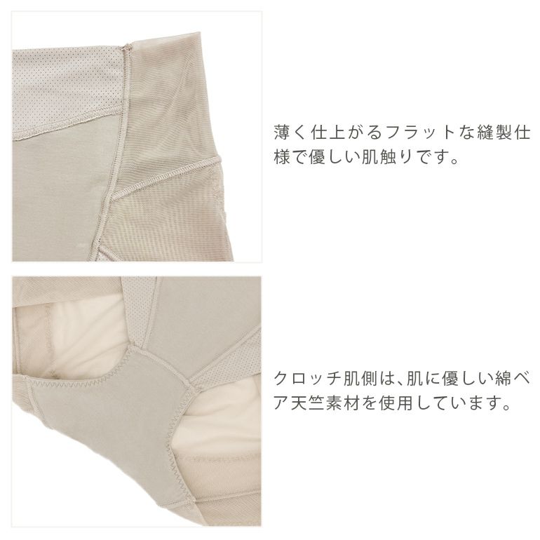 前ウエストは、通気性の良いメッシュトリコット素材を折り返した仕様で、くいこみにくく体の動きに優しくフィットします。またフロント部分はパワーネットと綿ベア天竺*の二重構造で、お腹を優しくカバーしてすっきりと整えます。後ろウエストはV字の立体設計で腰のカーブに沿いやすくフィット感が良いです。