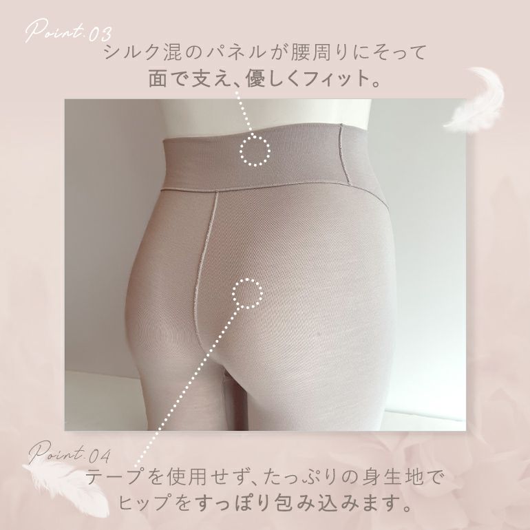 - シルクレーヨン混ベア天竺*を折り返した二重構造です。パワーネットを使用せず、伸縮性のある生地で広い面でソフトにお腹を押さえます。