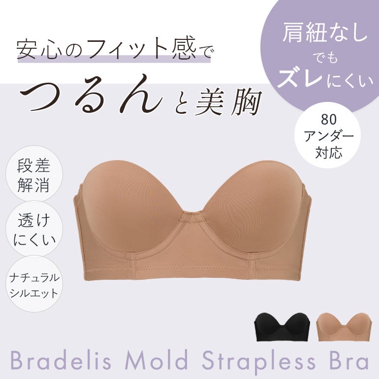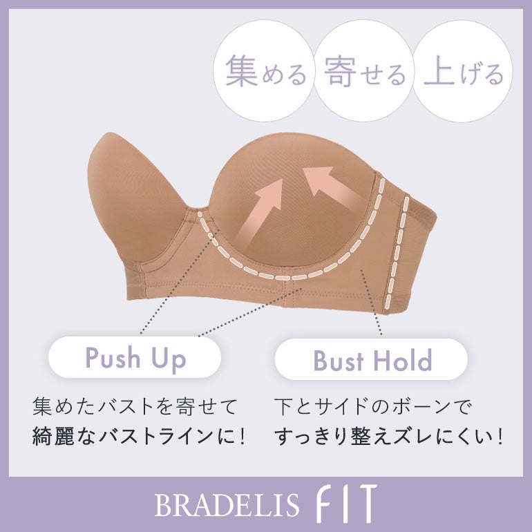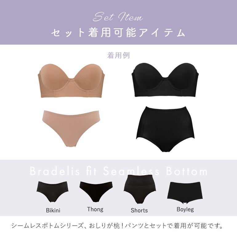 ぴったりフィット!80アンダー対応「モールドストラップレスブラ」 セット着用可能シームレスボトム さらに安定感をプラス!ウエストメイクニッパー こちらもオススメ フィットするセカンドスキン「BRADELISFIT」 着用方法