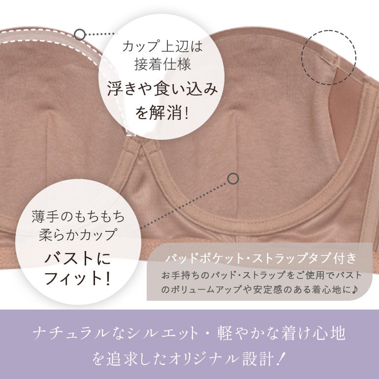 カップ裏は吸汗性がよく、優しい肌触りの綿100%天竺を使用。お手持ちのパッドやストラップを取り付けられる仕様で、お好みのフィット感に調節可能です。安定感と快適さを両立したこだわりの一着です。