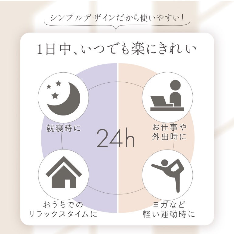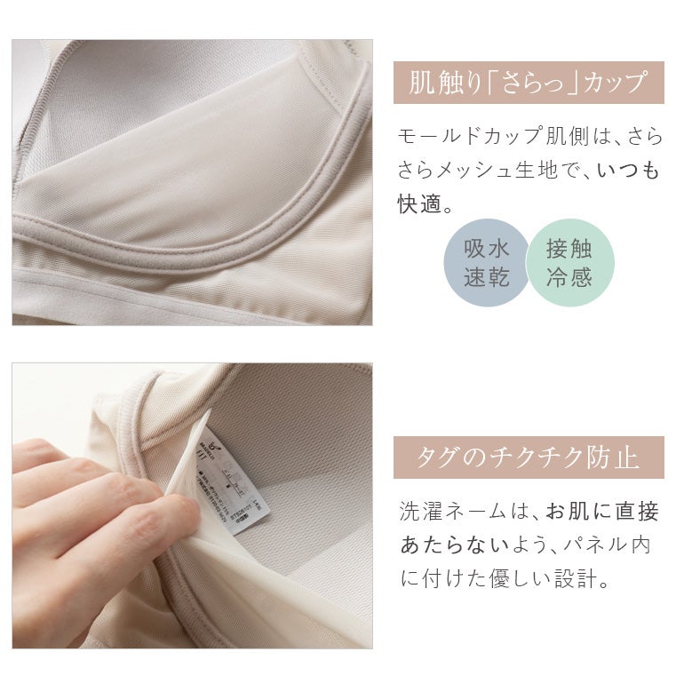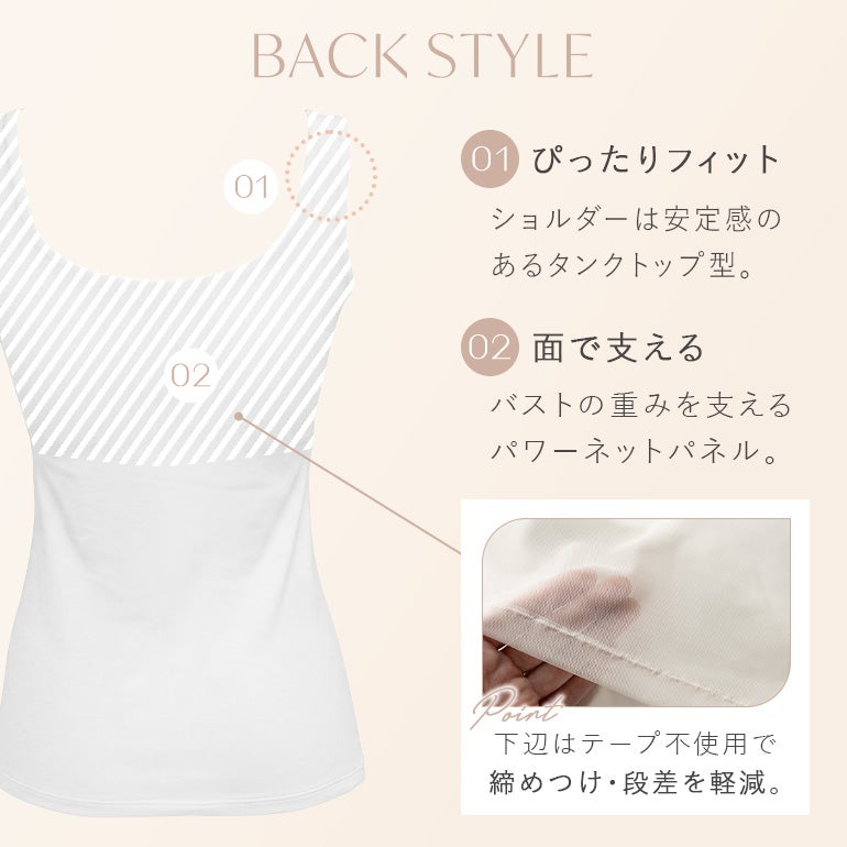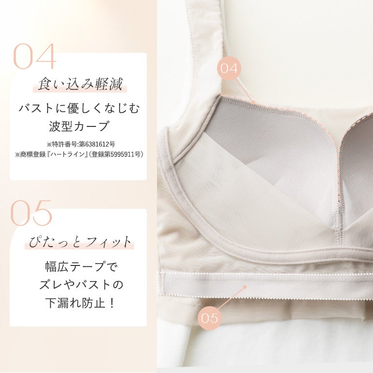 - (前)幅の広い「アンダーフィットテープ」により、「ズレ」「食い込み」「バストの下漏れ」を軽減。面でフィットして、しっかりバストを支えます。