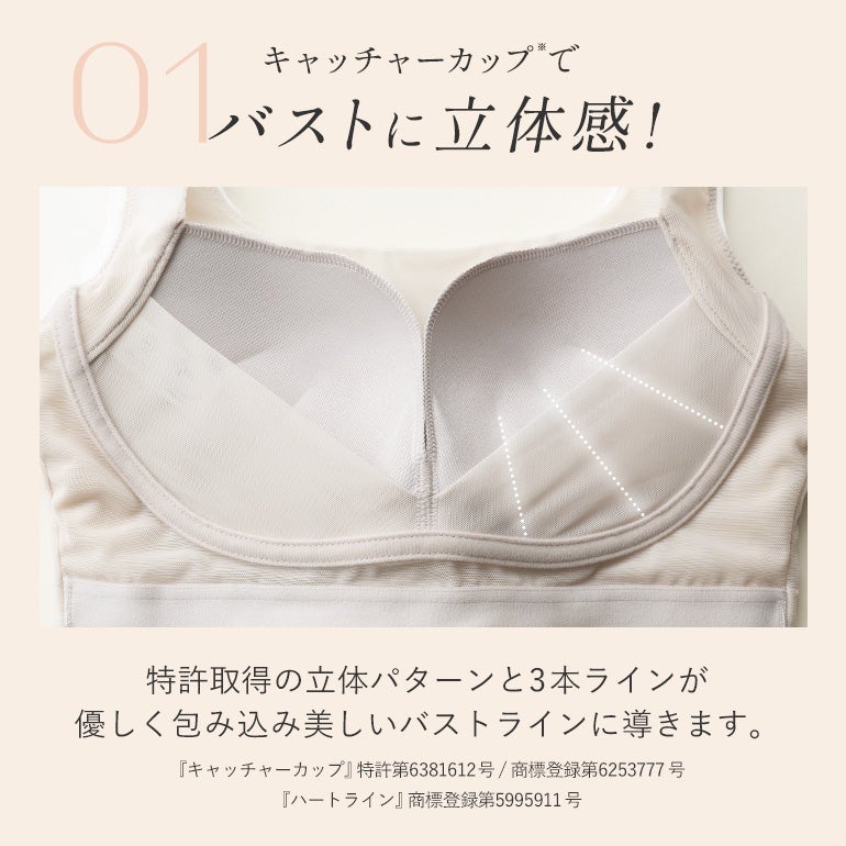 - バストを立体的に包み込むモールド加工を施したオリジナル開発の『キャッチャーカップ』を使用。カップの3本の縦ラインがバストをキャッチして立体的に馴染ませ、自然なバストラインを作ります。(※特許第6381612号)
