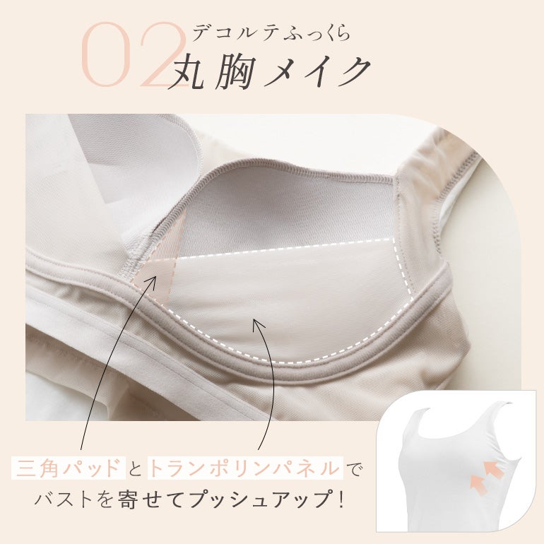 - 「トランポリンパネル」と中央の「立ち上げ三角パッド」がバスト中心を下から立ち上げ、立体感のあるナチュラルなシルエットに。