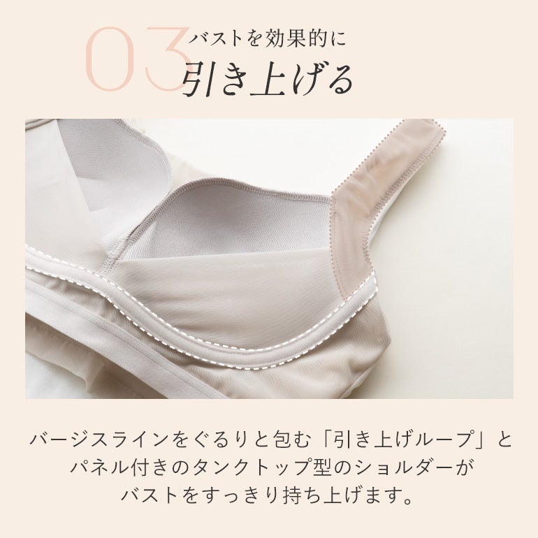 3本ラインの入ったフィット感の良いキャッチャーカップと「引き上げループ」でバストをしっかり持ち上げ、ノンワイヤーでも立体的な丸みのある美しいバストラインを実現します。(特許番号:第6381612号)