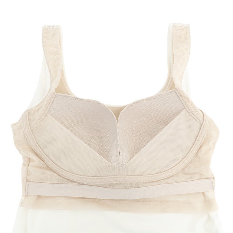ウエストラインをほどよくシェイプしたすっきりとしたシルエットで、ボディラインを美しく整えます。また、背中上部はパワーネットの裏打ちが面でしっかり支え、バストをサポートします。
