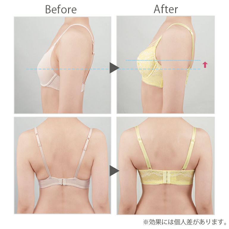 ステップ1の特徴である底面積の広いワイヤーが、集めたお肉を逃しにくく、さらに厚手の不織布*を使用したふわふわカップは集めたお肉をバストとしてよく馴染ませます。非常にフィット感がよく、小さいの方には谷間を作り、大きなバストの方はコンパクトラインに仕上げます。