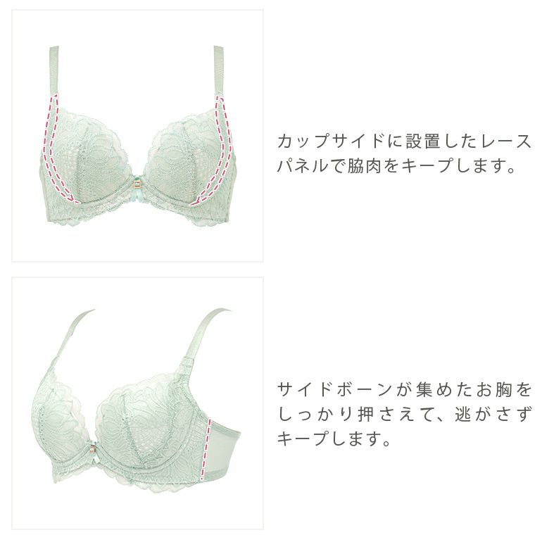 ステップ2の特徴は、幅の狭いワイヤーで、カップに深みを持たせているため、バストの高さをつくります。さらに、乳間が狭く、集めたバストを中心に寄せる機能を持っています。