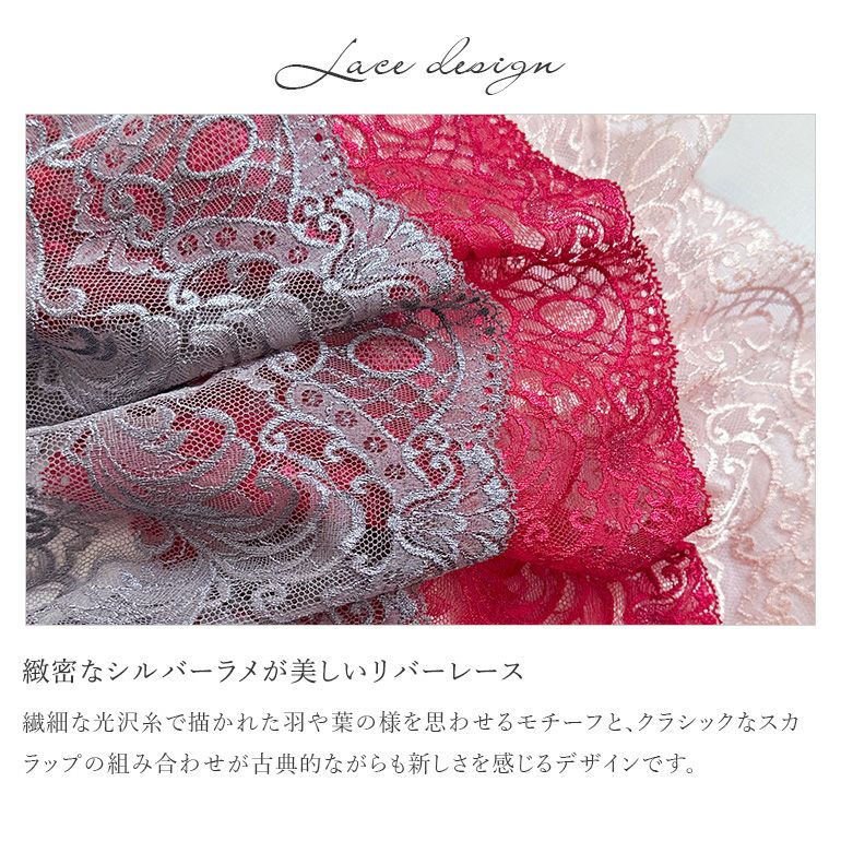 緻密なシルバーラメが美しいリバーレース*を使用したステップ2の補整ブラジャーです。クラッシックなスカラップと羽や葉を思わせるモチーフの組み合わせが古典的ながらも新しさを感じるデザインです。