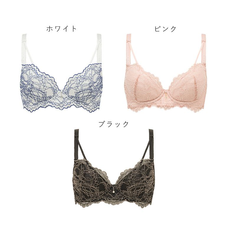 ストラップからカップ中央にかけて飾りテープを使用し、カップ土台やバックもレースを使用した華やかな総レースのデザインです。