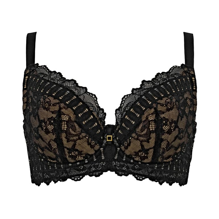 クラシックなフラワーモチーフの総柄に、ブレード風の直線柄のモチーフが組み合わされた、繊細さと大胆な雰囲気を併せ持つジャガード編みストレッチラッセルレース*を使用した、細身グラマー、グラマー向けブラジャーです。