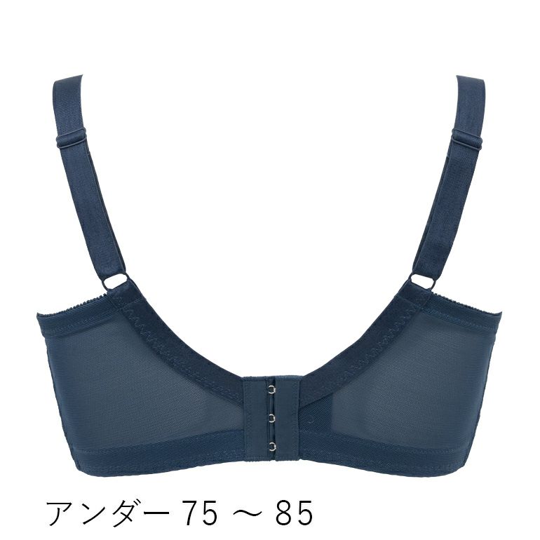 ワイヤー端が脇に食い込みにくく、カップサイドの膨らみを押さえて、柔らかいカップでバストをしっかり包み込みます。バックは幅広アンダーベルトとサイド脇高設計で、面で支えてすっきりしたシルエットを作り、安定感のある着用感です。