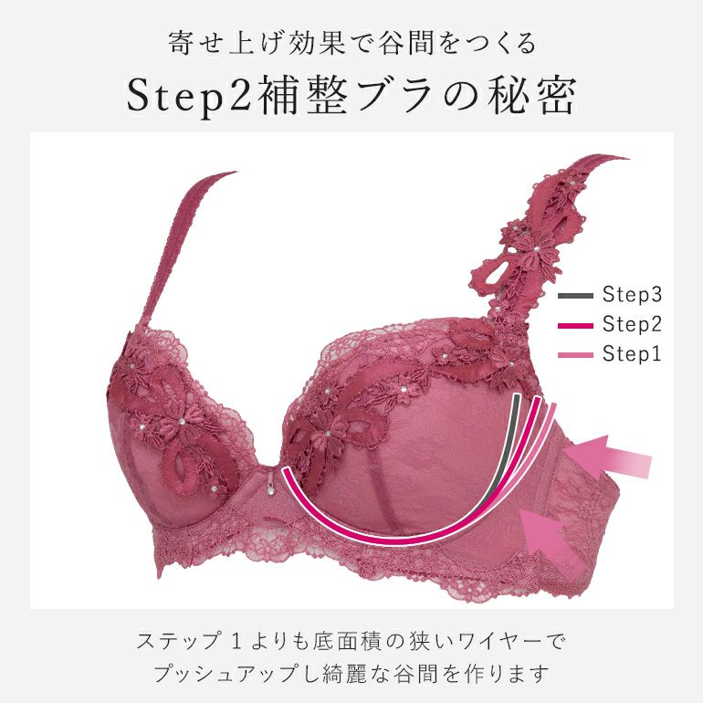 愛らしいリボンモチーフに、ラインストーンをあしらい精巧な細幅エンブロイダリーレース*を使用したステップ2の補整ブラジャーです。