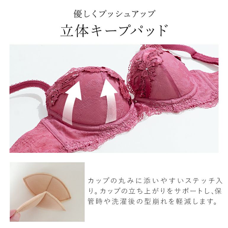 カップにリジットエンブロイダリーレース*を使用しているので、しっかり支えてバストトップを高い位置にキープします。