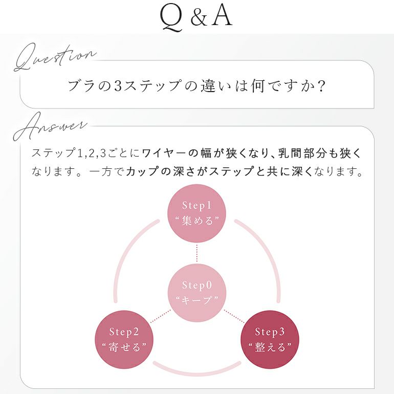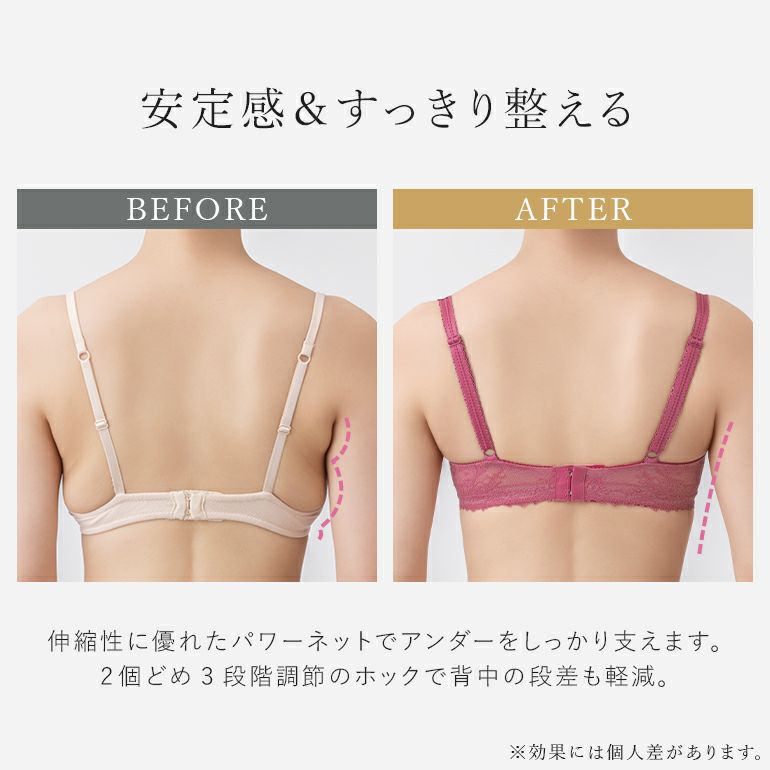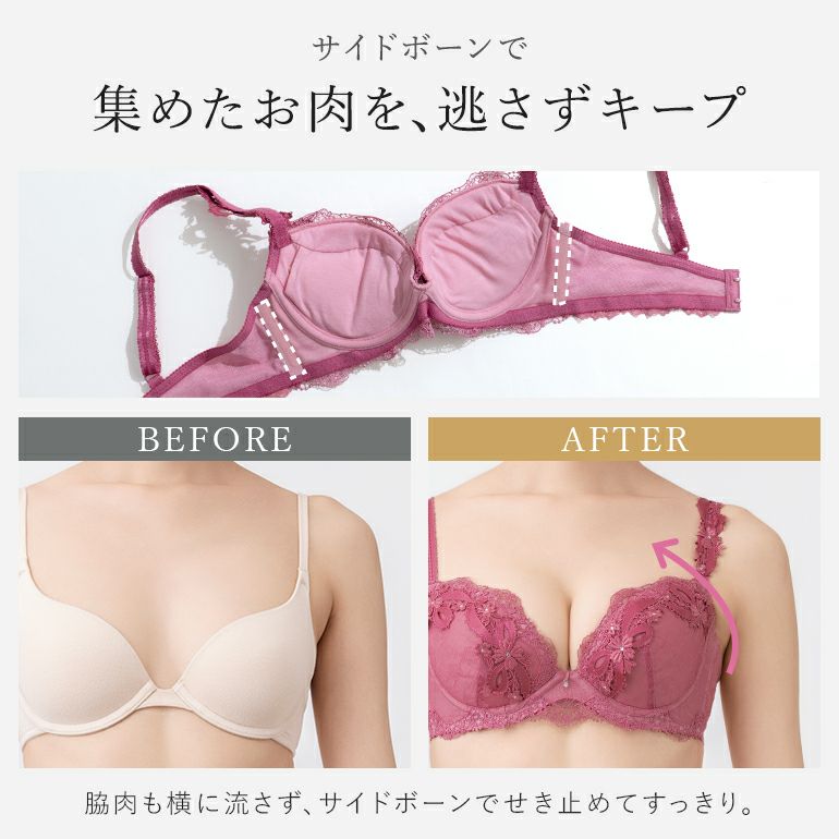 前浅ワイヤーが脇のお肉をすっきり整えて丸みのある女性らしいバストシルエットを作ります。