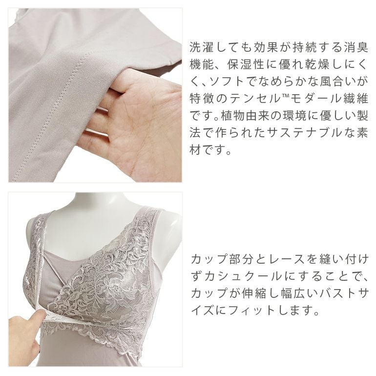 身生地には、植物由来で環境に優しいサステナブルなテンセル™モダール繊維*を使用。保湿性に優れ、しっとりとなめらかな肌触りです。カップ周りには、特許取得の独自の補整機能を施し、バストの横広がりを防いでサイドをすっきりと整えます。さらに、カップとカップを覆うレースを縫いつけないことで幅広いバストサイズに馴染みやすく、バストのシルエットを自然に美しく見せます。