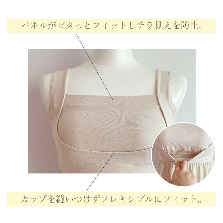 胸元は谷間見えを防ぐスクエア型で、アウターから見せる着こなしも楽しめます。