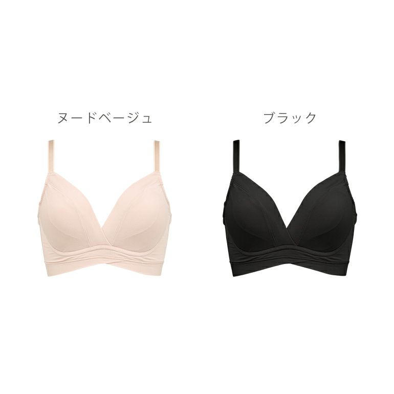 モールドカップと身生地を縫いつけず前中心をカシュクールデザインにすることで、様々なバストサイズに馴染みやすいです。またアンダー上部はわさ仕様*になっており、めくれ上がりにくく、窮屈さも軽減します。