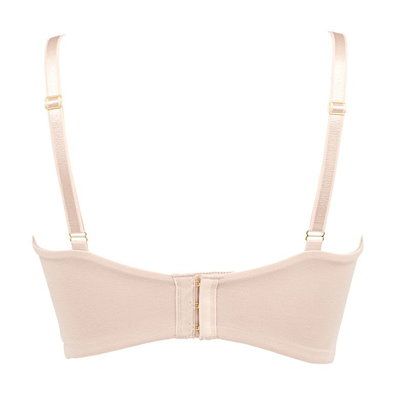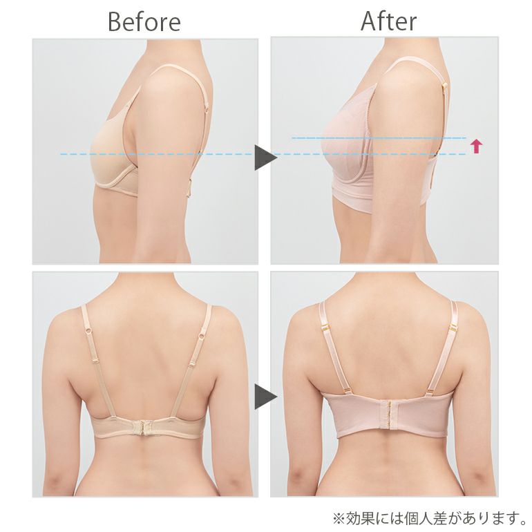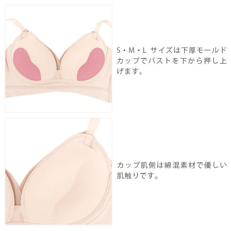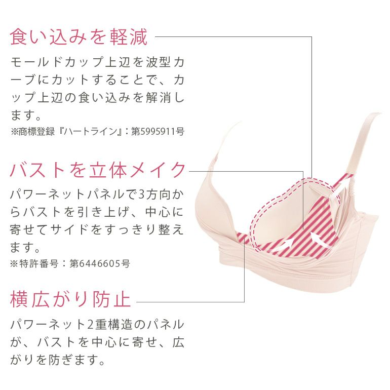 モールドカップの上辺を波型カーブ(ハートライン)にすることでバストに沿いやすく、フィット感を高めました。また、カップに隠されたバストを引き上げる独自機能で、バストを引き上げ横広がりを防止します。