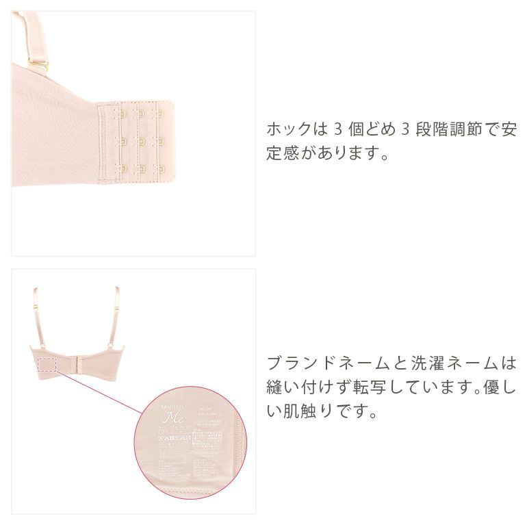 - カップ上辺のアーチ状に開いた穴と、カップに通してストラップまで繋がっていることで、バストを引き上げ横広がりを防ぎます。