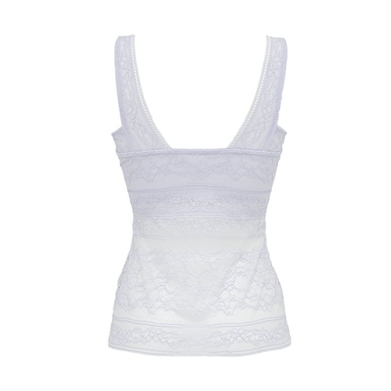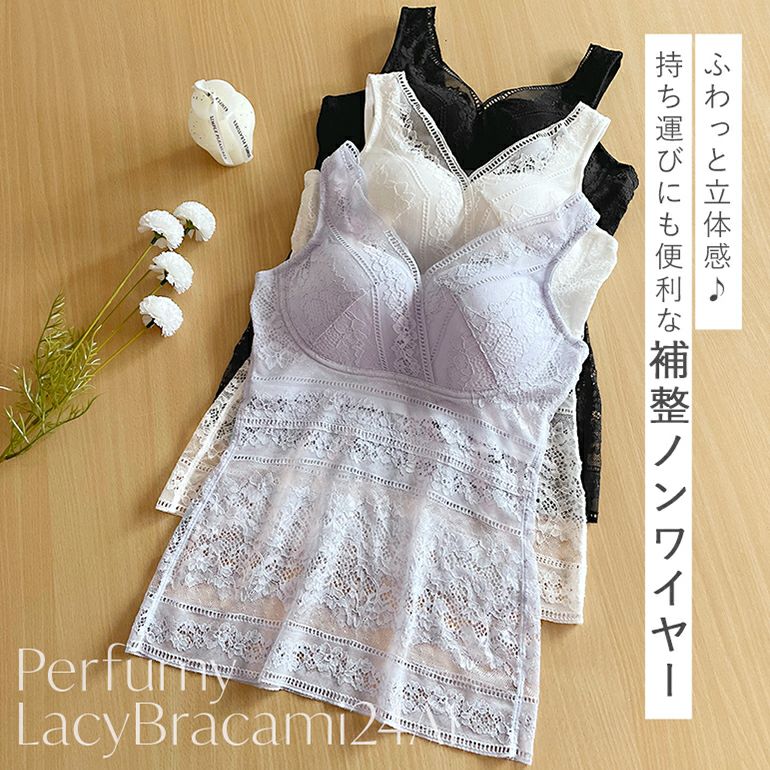 直線状のスカラと花柄を組み合わせた、トレンド感のあるストレッチラッセルレース*を使用した、アウターライクなデザインの補整ノンワイヤーブラキャミです。
