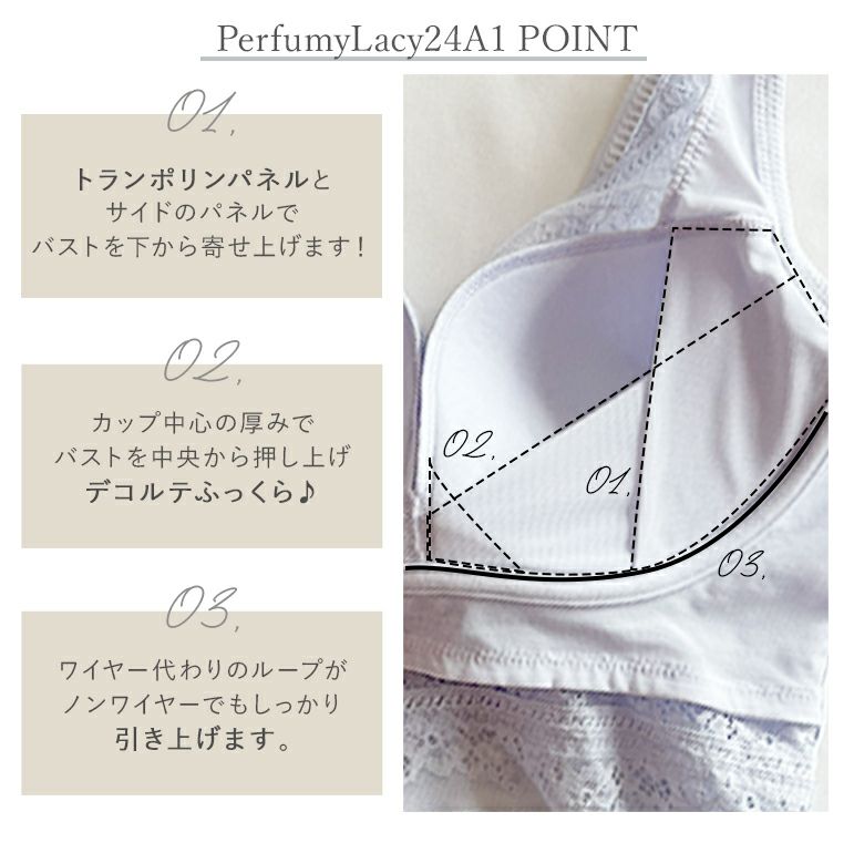 また、カップ周りの独自の補整機能で、左右からバストを中心に寄せて横広がりを軽減し、ノンワイヤーでも丸みのある美しいバストシルエットをつくります。