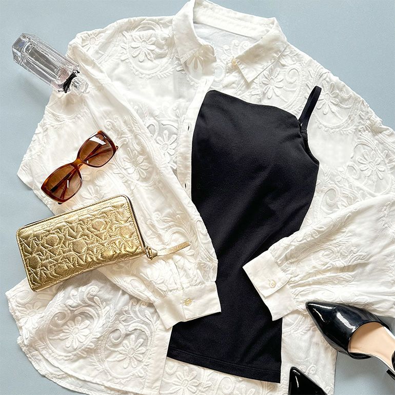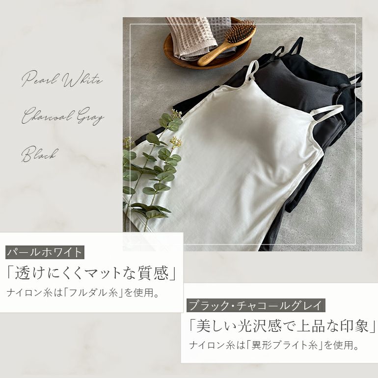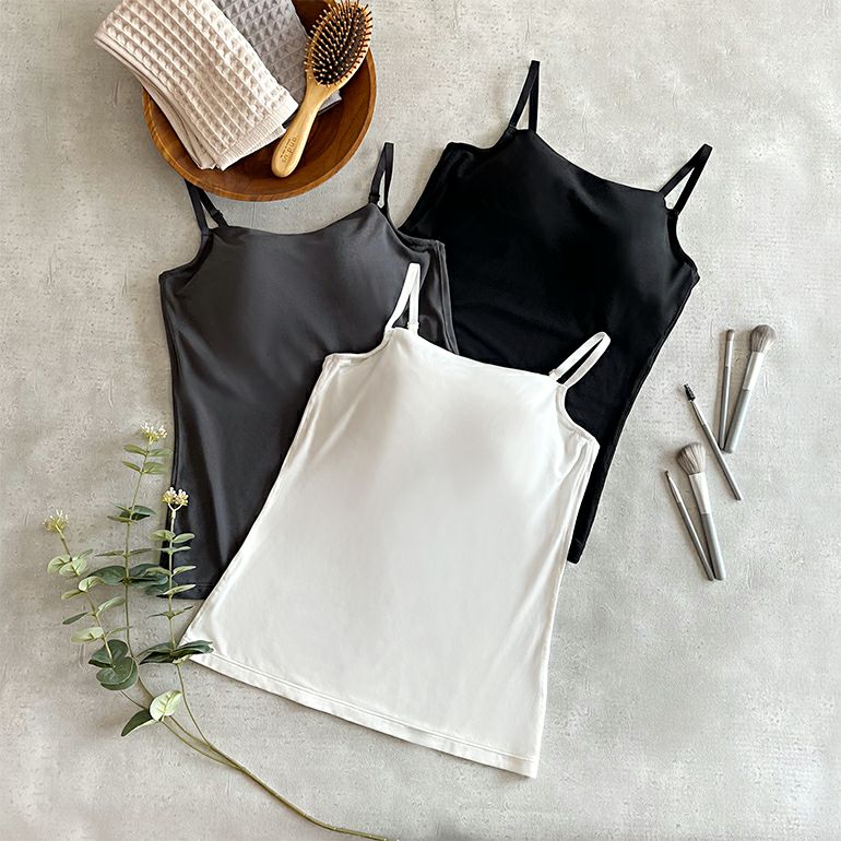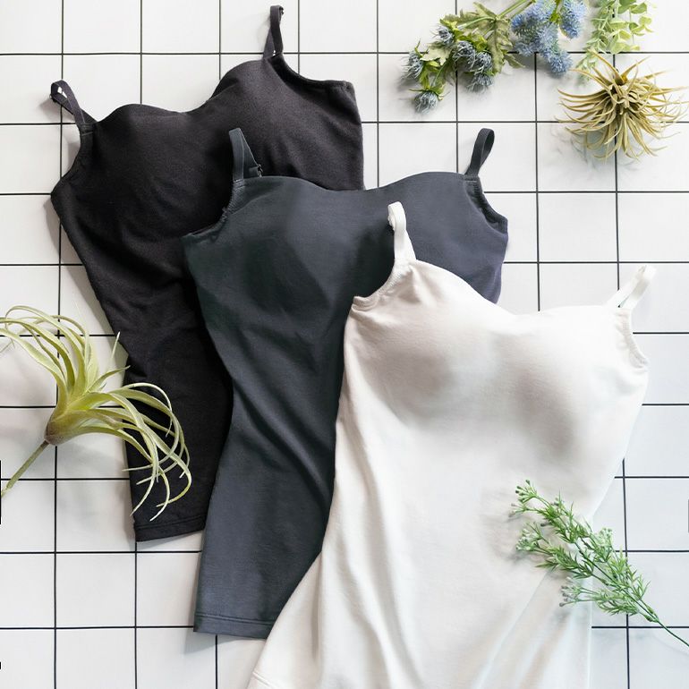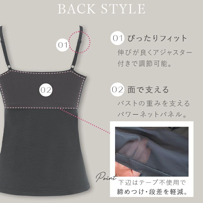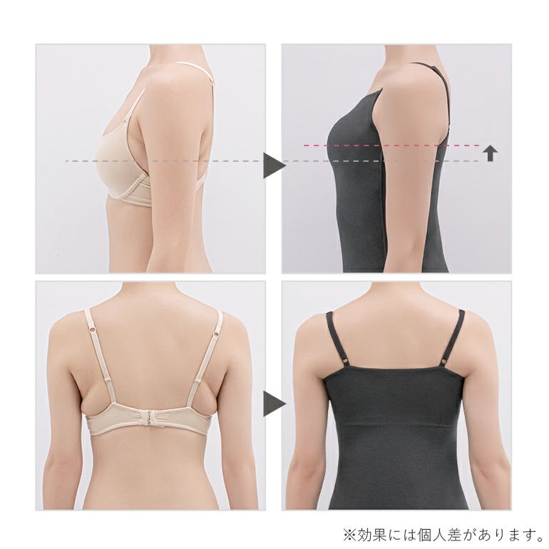アウターライクなデザインで、デイリー使いにぴったりな補整ノンワイヤーブラキャミです。すっきりとしたシルエットで、ボディラインを美しく見せます。