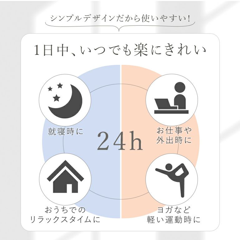 優しい着心地で、デイリー使いや就寝時のナイトブラはもちろん、ヨガやエクササイズなど軽いスポーツインナーとしても24時間着用いただけます。