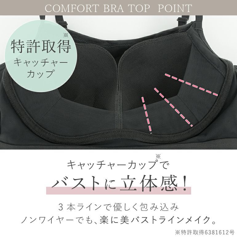 特許取得の「キャッチャーカップパターン」と独自の補整機能で、ノンワイヤーでも立体的な美しいバストラインを実現します。(特許番号:第6381612号)