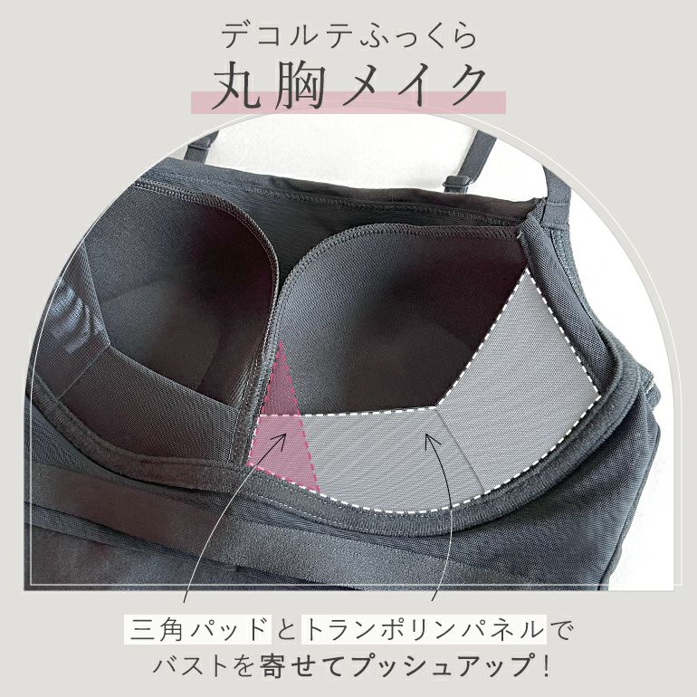 - 「トランポリンパネル」と中央の「立ち上げ三角パッド」がバスト中心を下から立ち上げ、ふっくらとしたデコルテをつくります。