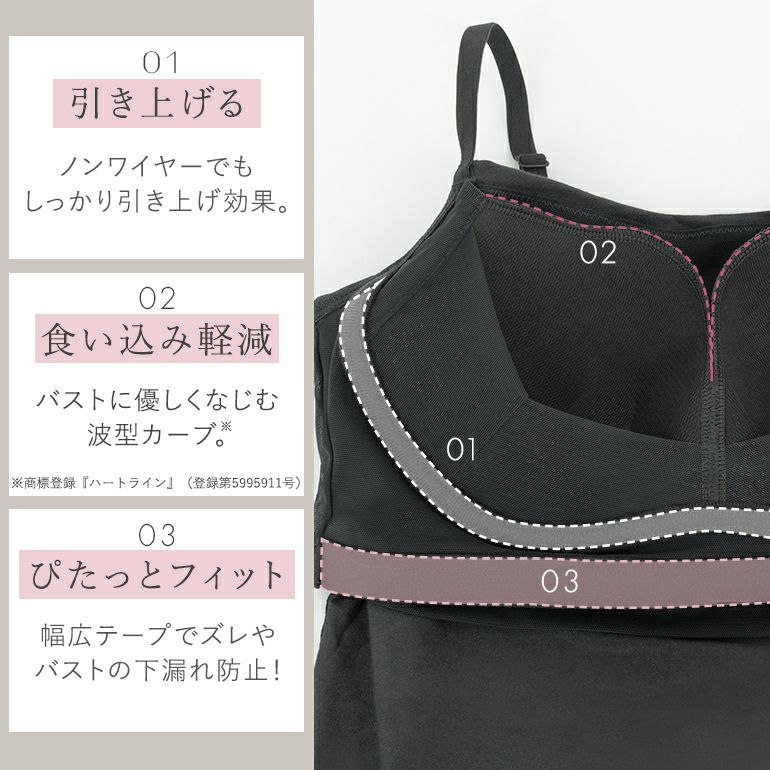 - 幅の広い「アンダーフィットテープ」により、「ズレ」「食い込み」「バストの下漏れ」を軽減。