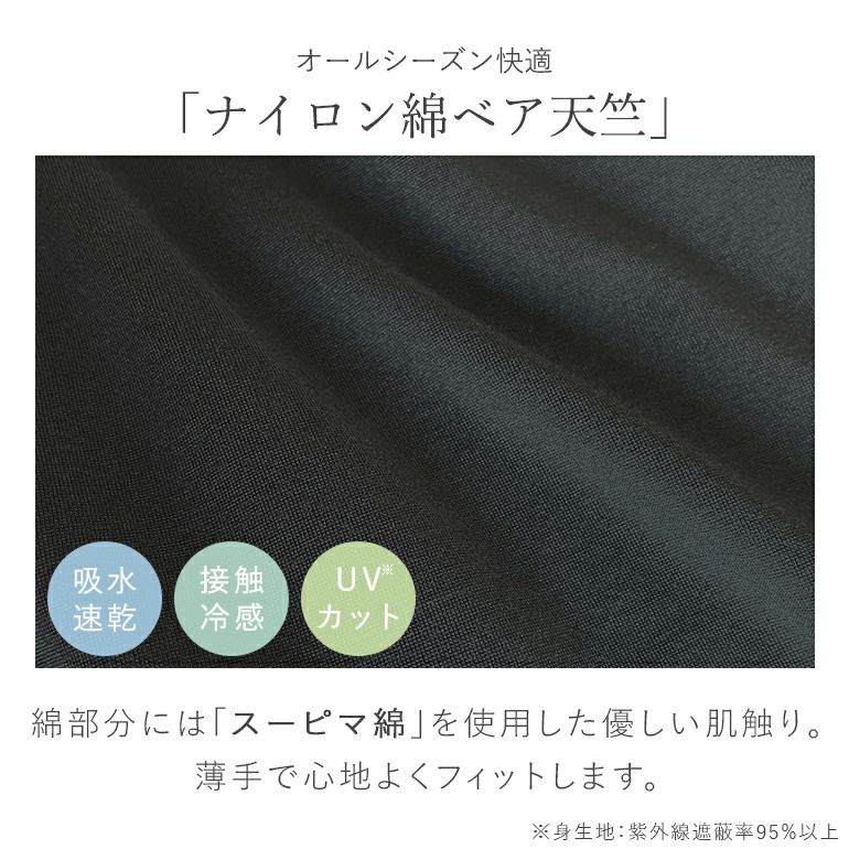 身生地には伸縮性の良い「ナイロン綿ベア天竺*」を採用。35mm以上の超長綿繊維に限定された《最高級ランクのスーピマ綿》を使用しており、肌との摩擦が少なく、なめらかで優しい着心地です。