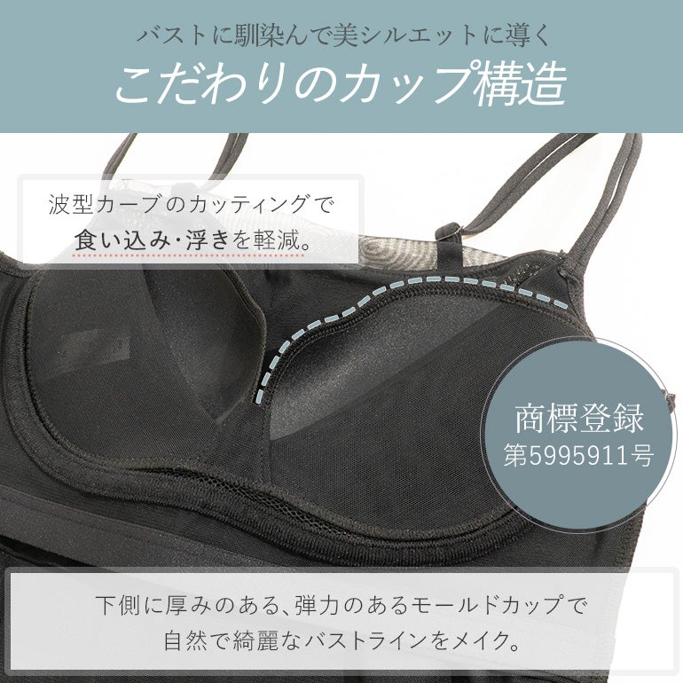 - 18mm幅のアンダーテープがバストのずれ上がりや下流れをしっかり防止。特許取得のメッシュテープ構造(特許番号:第5185887号)をバージスラインに沿って採用し、バストの大きさに合わせて網目が伸縮。