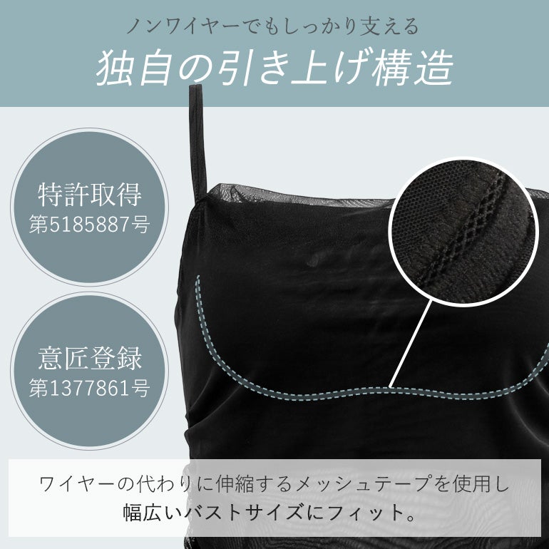 バージスラインにフィットする特許取得のメッシュテープ構造(特許番号:第5185887号)を採用。ワイヤーの代わりにバストをぐるりと包み込む『引き上げループ』と組み合わせることで、バストを持ち上げて引き上げます。