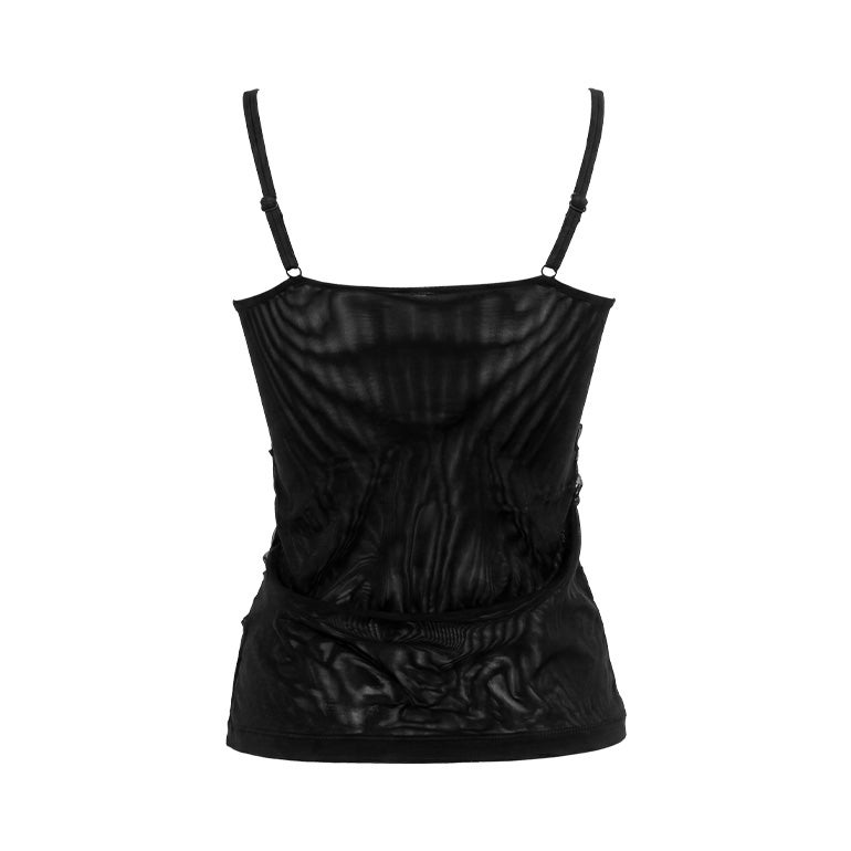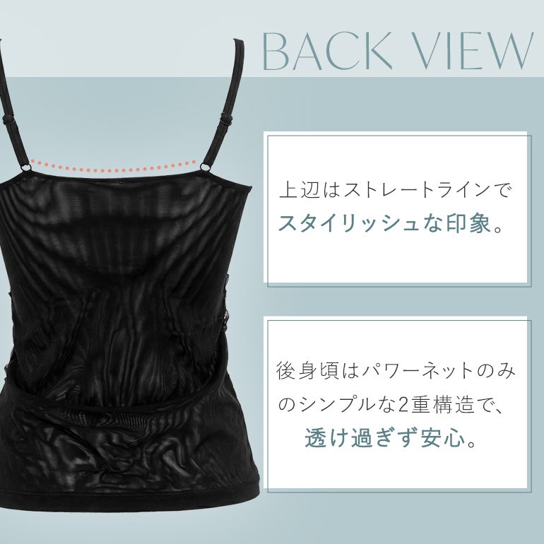 後身頃はパワーネットのみのシンプルなデザイン。生地を二重にすることで、過度な透けを防止します。