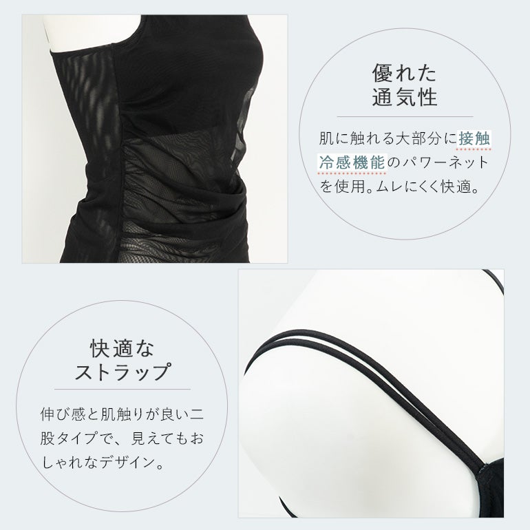 ストレッチチュールにギャザーを施したトレンド感のあるデザインと、接触冷感機能のあるパワーネットが特徴。