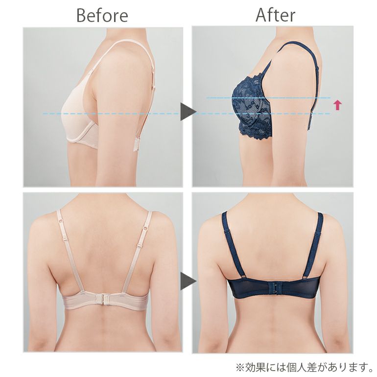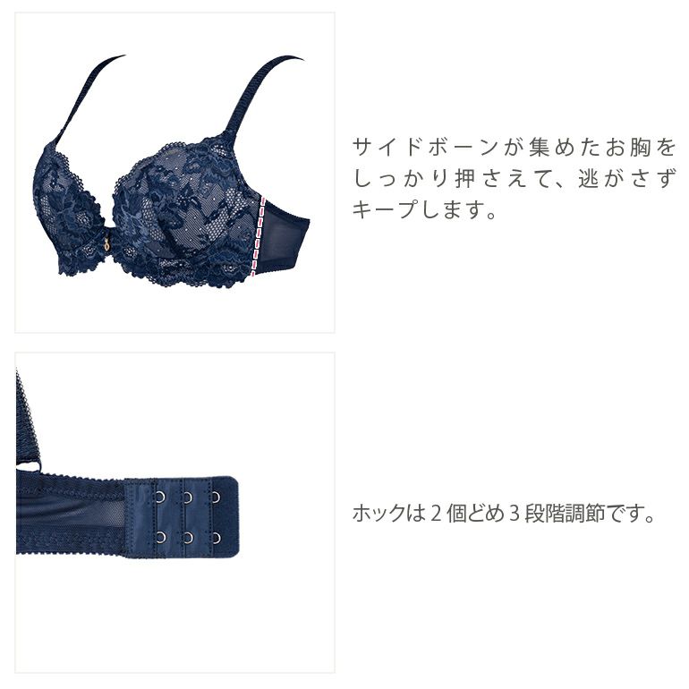 ステップ2の特徴は、幅の狭いワイヤーで、カップに深みを持たせているため、バストの高さをつくります。さらに、乳間が狭く、集めたバストを中心に寄せる機能を持っています。