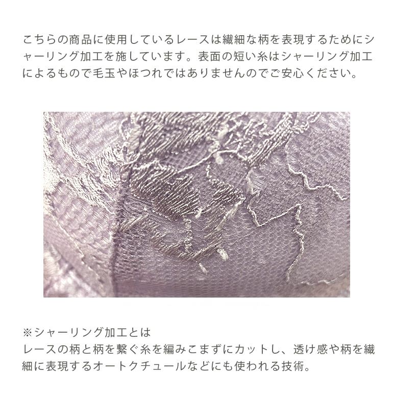 光沢糸と織りの濃淡で花の立体感を表現し、奥行きが感じられるストレッチラッセルレース*を使用した、育乳ステップ2のブラジャーです。大小2種類のネットを織り交ぜることにより、高級感と繊細さを併せ持ったデザインです。