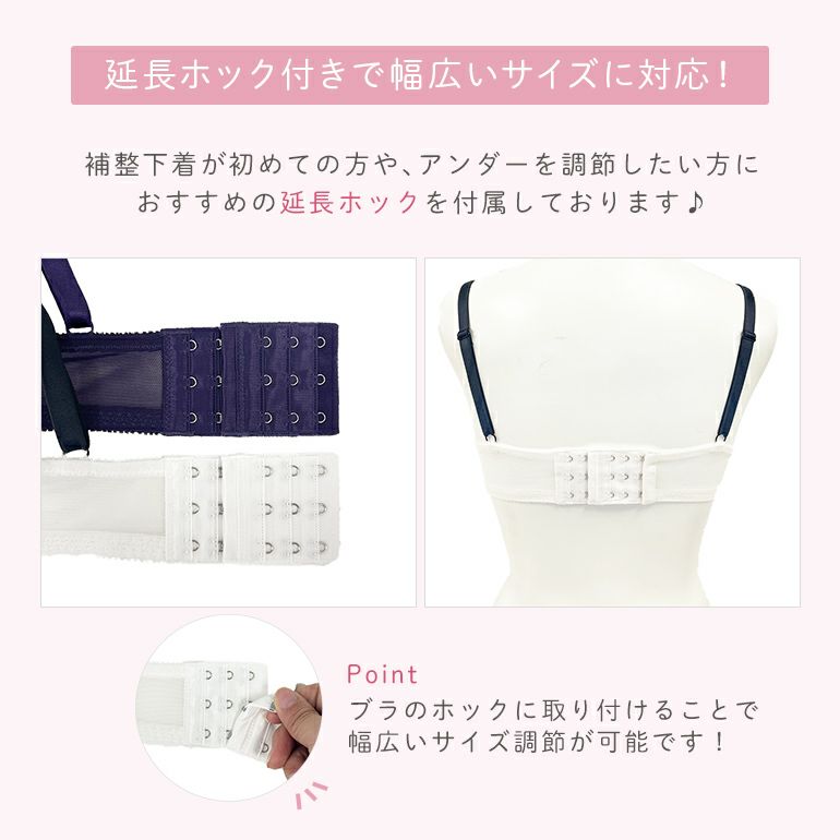 その他の特徴として、アンダーサイズが調節できるよう延長ホックを付属しているため、補整ブラ初心者の方におすすめです。
