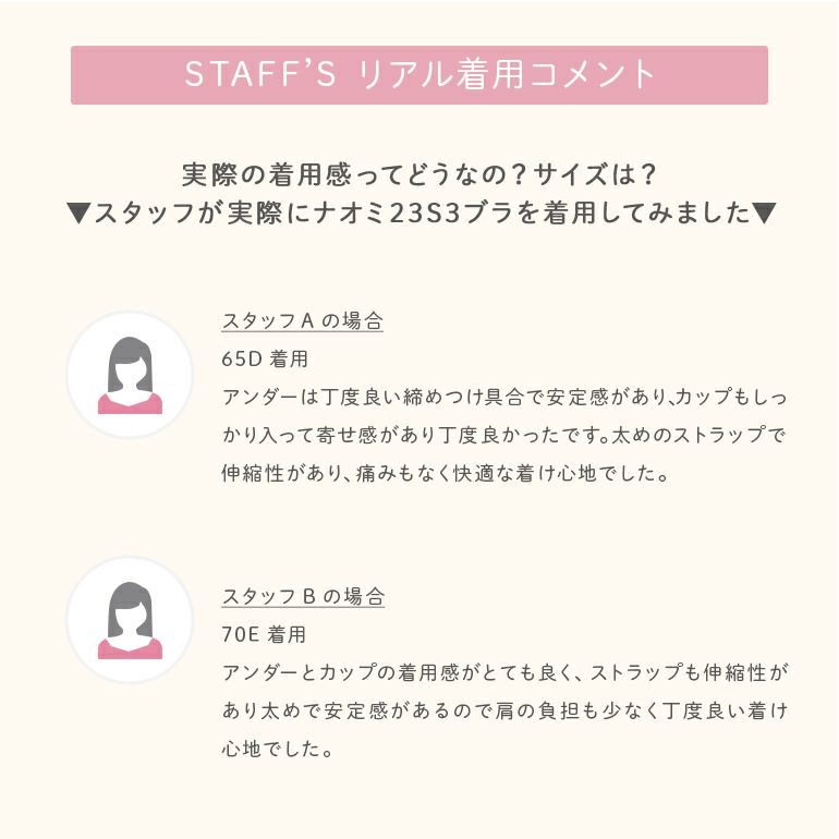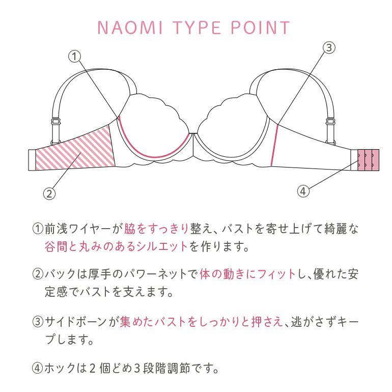 特にナオミステップ2ブラ23S3は、サイドの脇高設計と前浅ワイヤーが脇をすっきり整えて、ふんわり女性らしいバストを演出します。プッシュアップ機能が高く、しっかりとバストを中心に寄せ上げ綺麗な谷間を作ります。さらに、バックは伸縮性とキックバック性のある厚手パワーネット1枚仕様のため、動きに馴染みやすくフィットします。