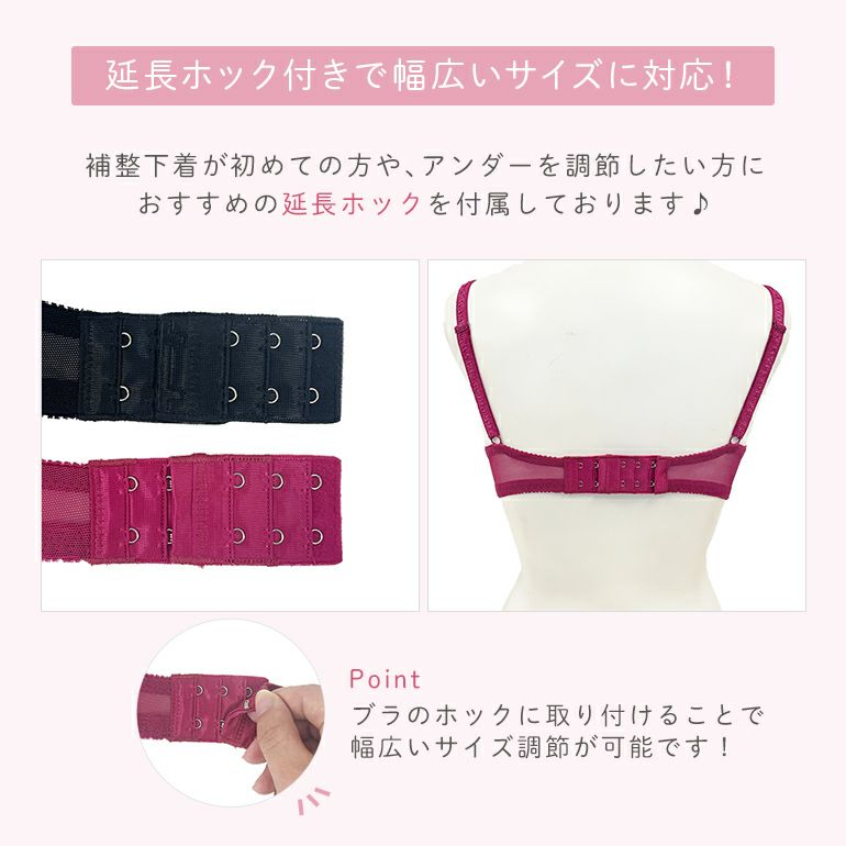 アンダーサイズが調節できるよう延長ホックを付属しているため、サイズ選びがご不安な方にもおすすめです。
