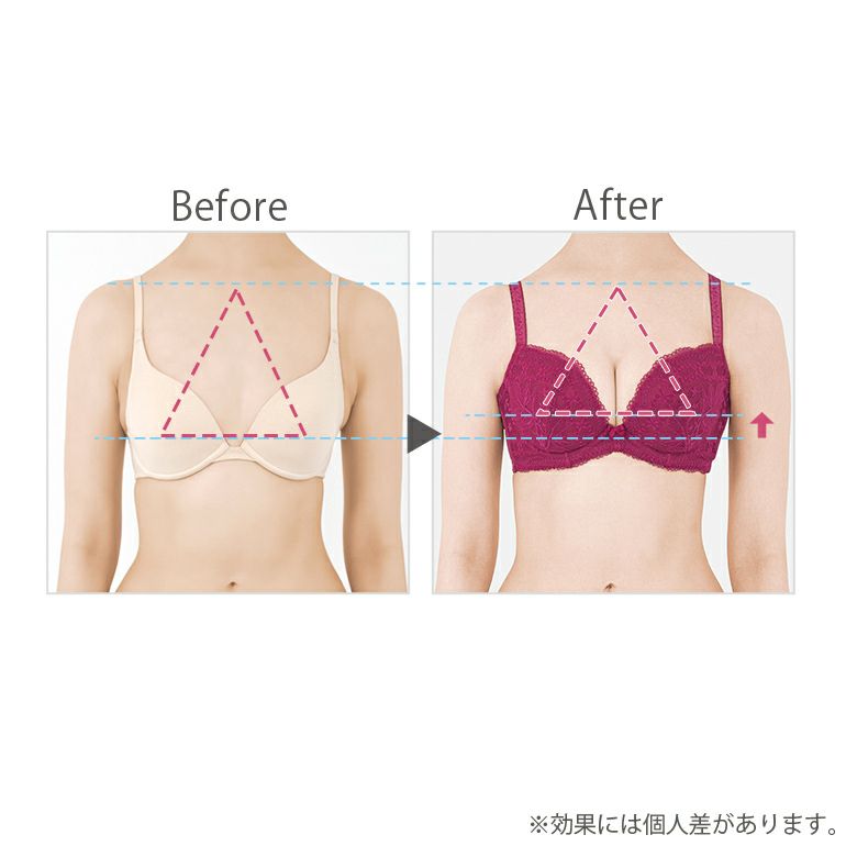 ステップ2の特徴は、幅の狭いワイヤーで、カップに深みを持たせているため、バストの高さをつくります。さらに、乳間が狭く、集めたバストを中心に寄せる機能を持っています。