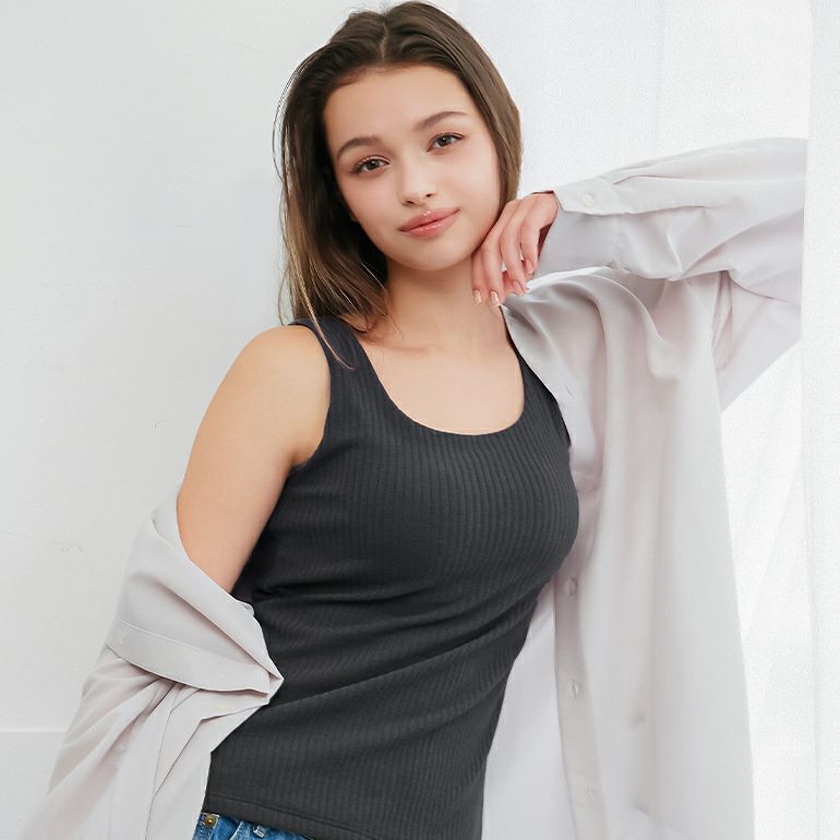 特許取得のパターンを採用し、ブラ+タンクトップが1枚になった補整タンクトップです。アウターとして1枚で着用でき、シンプルで上品なデザインです。