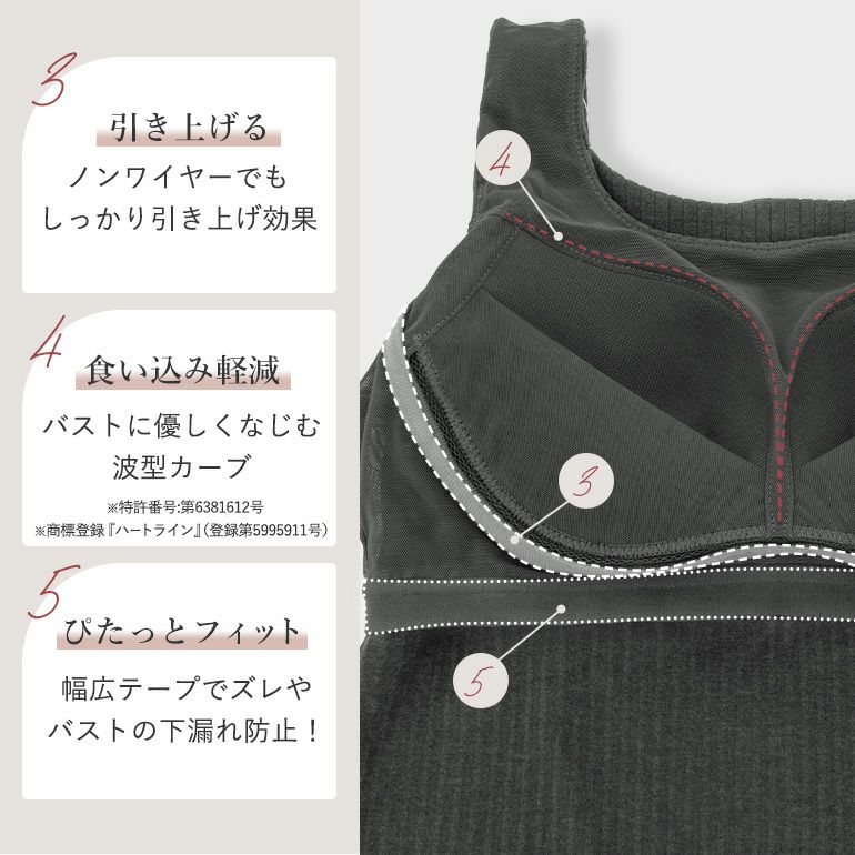 - バストになじみやすい波型カーブのカッティングで食い込みや浮きを軽減。※商標登録『ハートライン』(登録第5995911号)