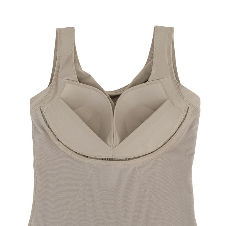 肩接ぎ部分のみパワーネットを抜くことで、柔らかく伸縮性がアップ。幅広いサイズに対応し肩への負担を軽減します。