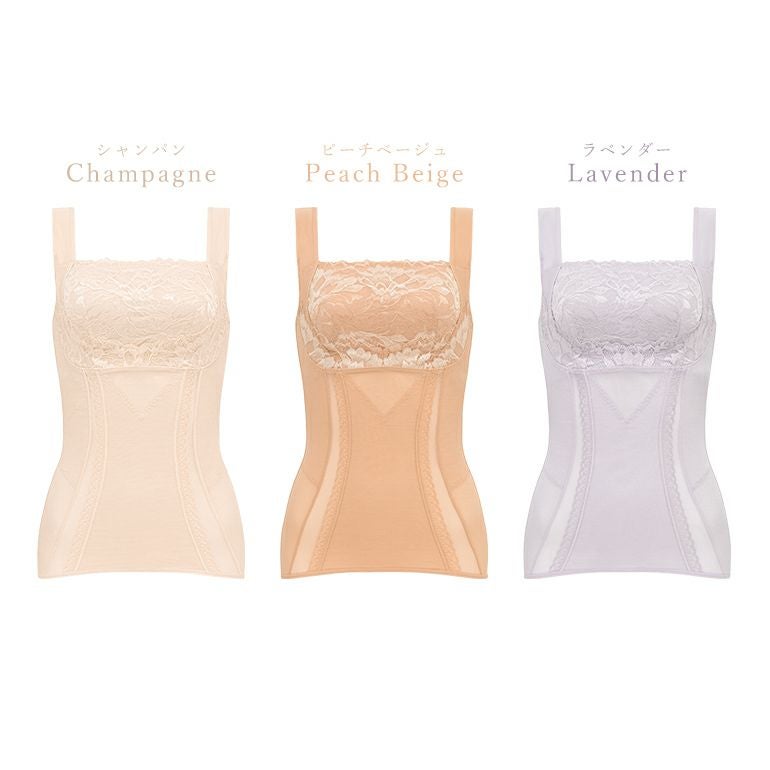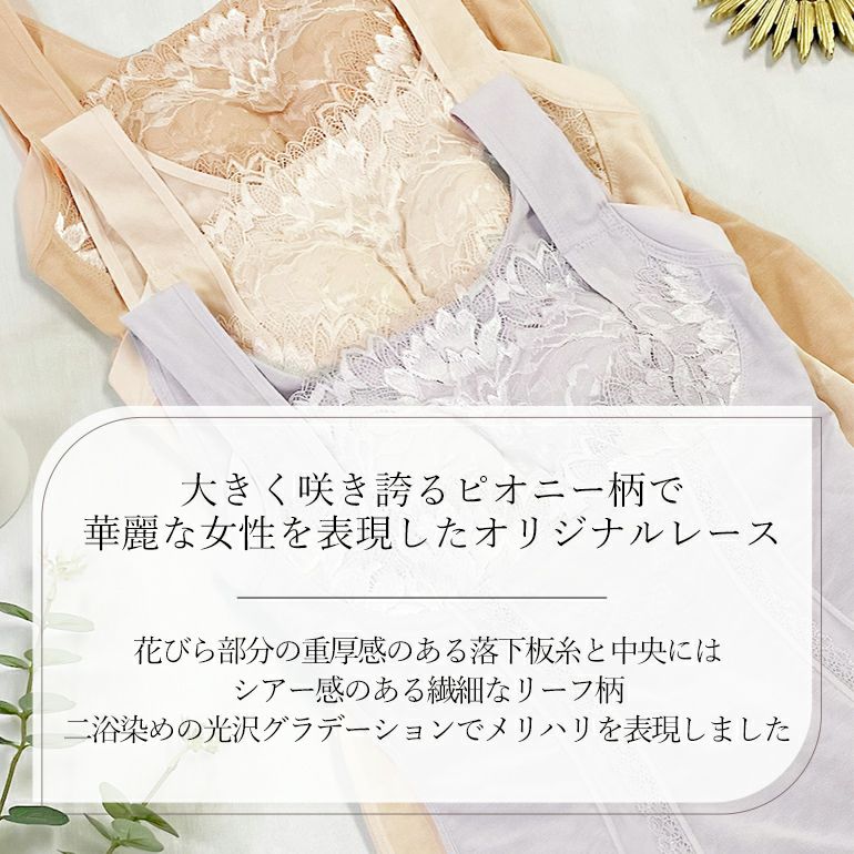 二浴染め*の光沢グラデーションが美しい、大きく咲き誇るピオニー柄と繊細なリーフ柄のオリジナルデザインのレースを使用した、シェイパー機能付きブラキャミです。立体裁断のオリジナルパターンで、締めつけ過ぎない着心地と補整機能を両立します。