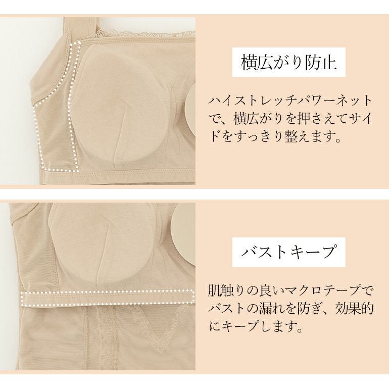カップ周りに施された独自の補整機能でバストを中心に寄せて横広がりを防止し、サイドをすっきりと整えます。また、カップのアンダー部分が本体と縫い付けられていない為、カップの可動域が広がり様々なバストサイズにフィットします。