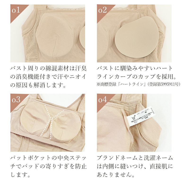 - 三枚接ぎの立体パターンで身体にフィット。上辺は、ソフトパワーネットを裏打ちした二重構造で安定感が良く、脇肉を押さえてバストの下流れを防ぎます。