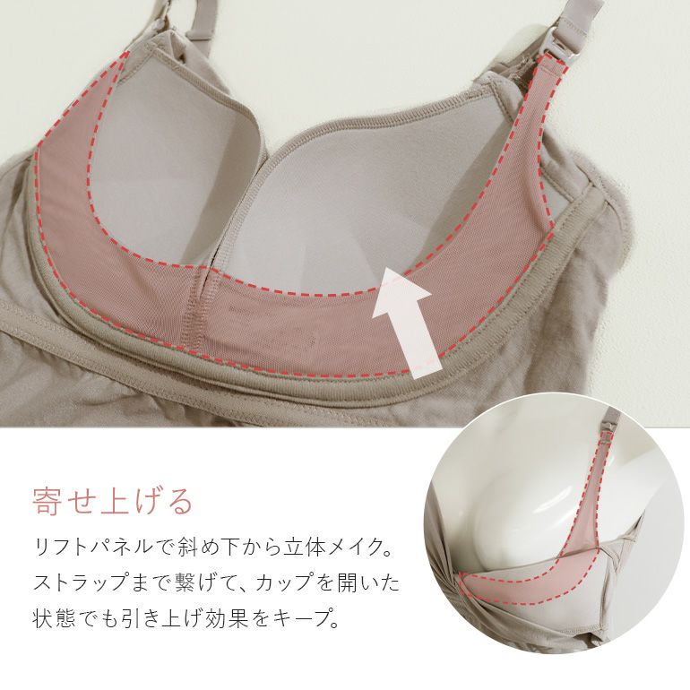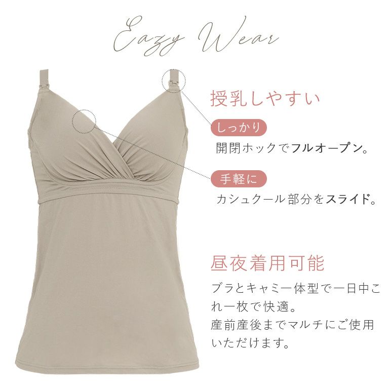 デイリーから産前産後まで長く使える、24時間着用可能なフロントオープンタイプの授乳ノンワイヤーブラキャミです。ソフトな着け心地で、日中や外出先、就寝時も快適に美胸をサポートします。