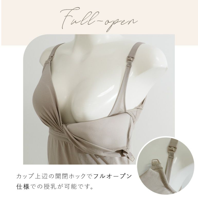 また、開閉ホック搭載でフルオープンでの授乳もしくはカシュクール部分をスライドさせての授乳が可能です。
