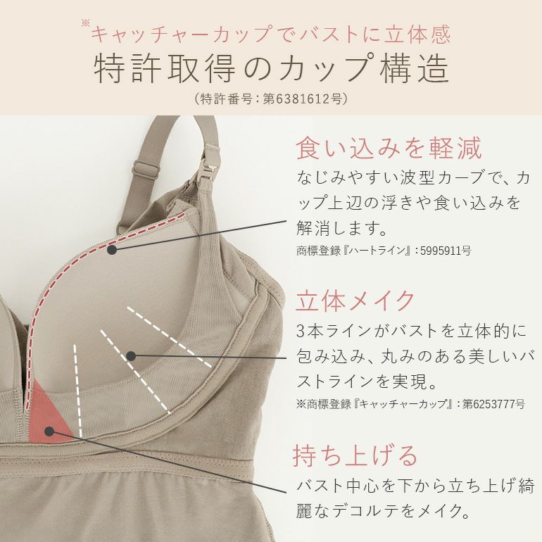 - バストを立体的に包み込むモールド加工を施したオリジナル開発の『キャッチャーカップ』を使用。(特許番号:第6381612号)